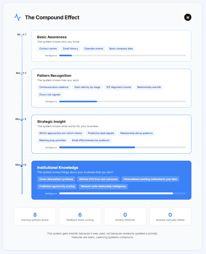 Six months from now, the system running underneath that dashboard will be different from the one that exists today. Not because we updated it. Because people used it. Their deals, their patterns, their feedback, their relationships will have reshaped what the system knows, what it surfaces, and what it recommends.