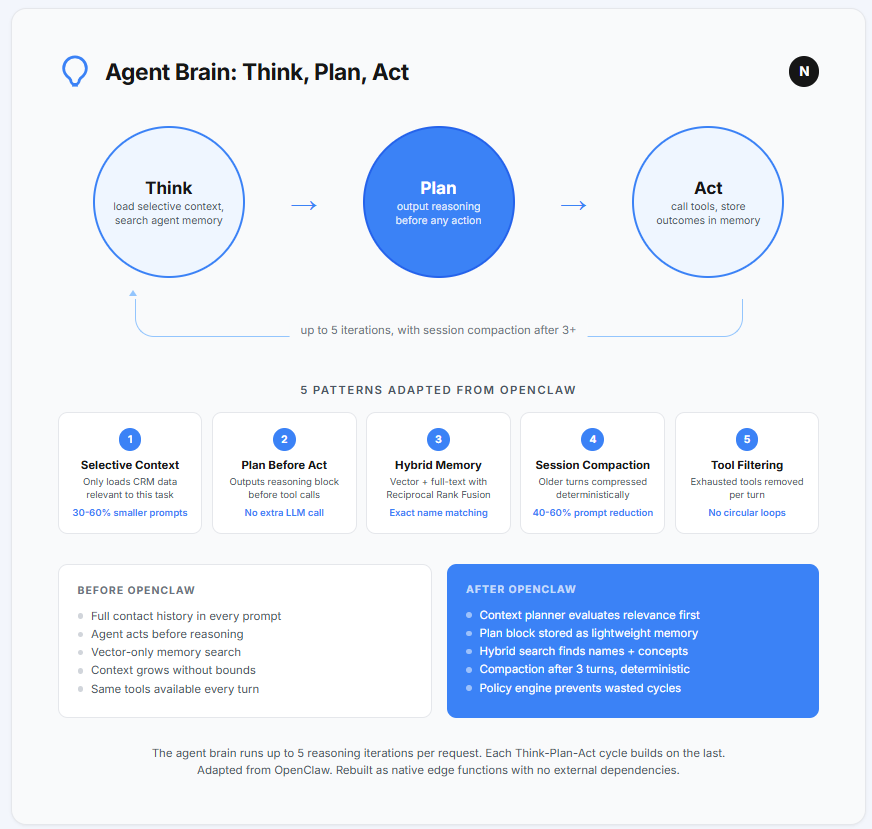 We adapted the core reasoning patterns from an open-source project called OpenClaw. Their work on selective context injection (giving the agent only what it needs, not everything) and planning-before-action (requiring the agent to state its reasoning before doing anything) cut our prompt sizes by 30 to 60 percent and eliminated the circular reasoning problem entirely.