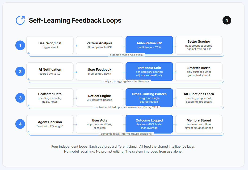 Not a smarter model. Not a better prompt. Not a feature someone shipped last Tuesday. What’s underneath is a system that treated every interaction, every won deal, every thumbs down on a notification, every email that got a reply, as raw material. And it built something from that material that didn’t exist on day one.