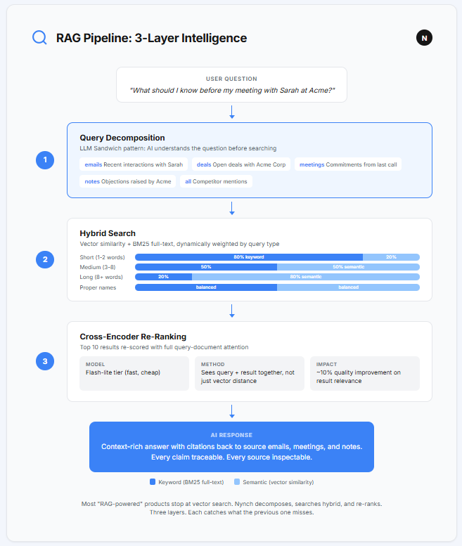You need both. And you need them weighted differently depending on the question. Short, specific queries (”Sarah pricing”) need more keyword weight. Longer, conceptual queries (”what should I know before meeting the Acme team?”) need more semantic weight.