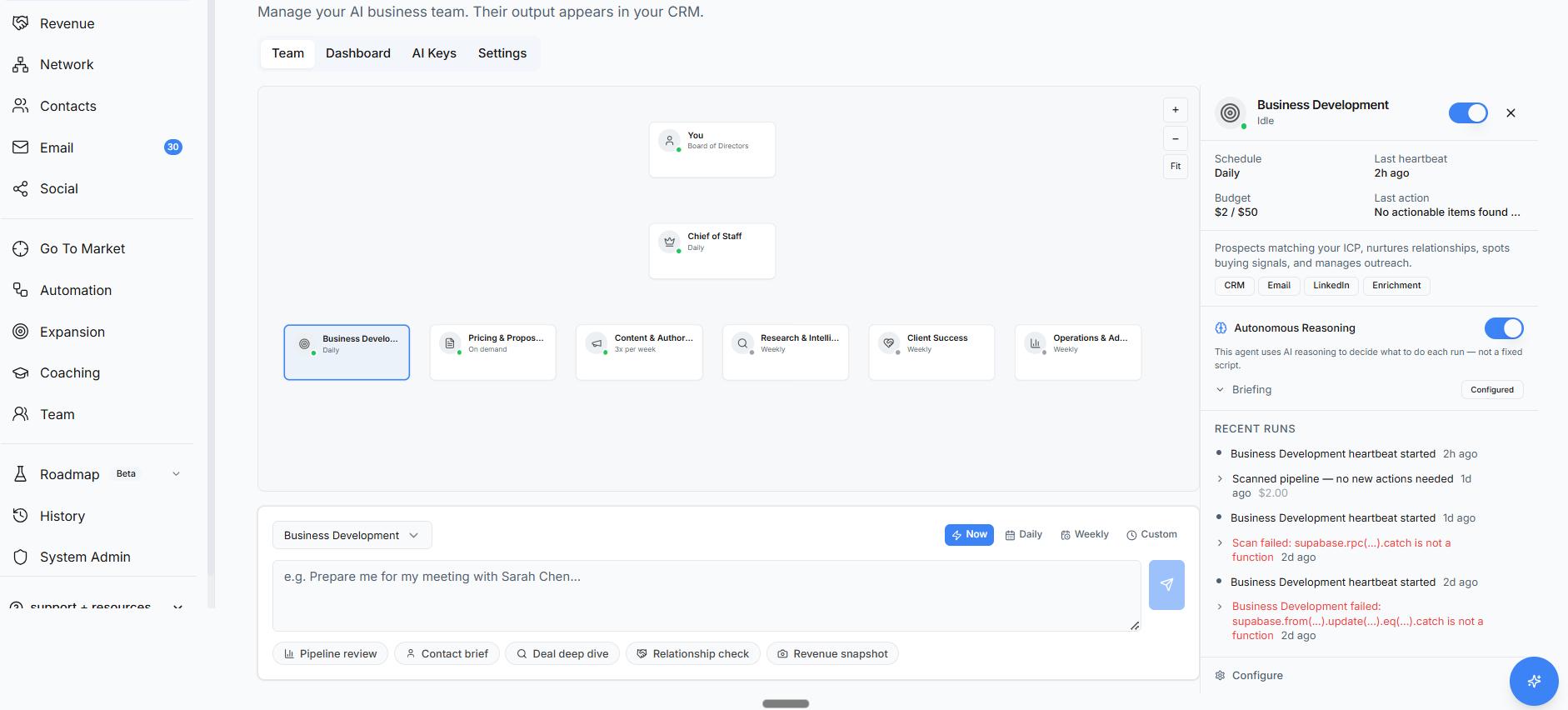 Month 1. It knows your rhythms. Who you talk to often. Who you’ve been neglecting. How long your deals usually take at each stage. Where things tend to stall. It starts having opinions, and some of them are right. You catch yourself checking its morning briefing before you check your inbox.