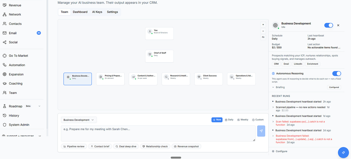 A clean dashboard. Agent cards with names like “Chief of Staff” and “Business Development.” Status badges. Budget meters. A toggle switch you can flip on. Every emerging market leader AI product has a version of this screen. It’s the moment in the demo where someone says “and here’s your AI team” and waits for you to be impressed.